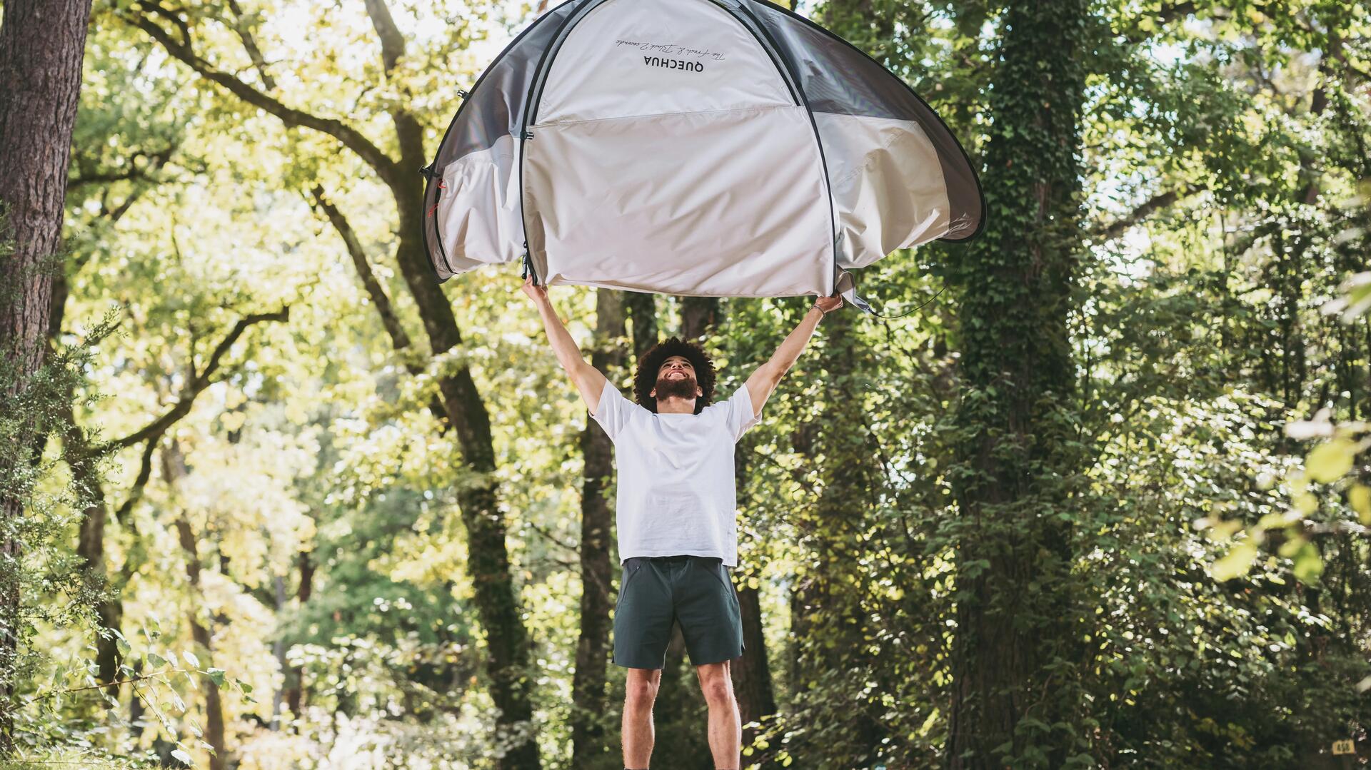 Por termos consciência de que é necessário agir para preservar o nosso terreno de jogo, a Quechua compromete-se a limitar o impacto ambiental dos seus produtos. O quarto desta tenda é greige, o que significa que o tecido não foi tingido. Mantém a sua cor natural. O tingimento é um dos aspetos que tem um maior impacto no meio ambiente.Mas não basta, por isso estamos a trabalhar para que esta barraca tenha um ecodesign até 2026.