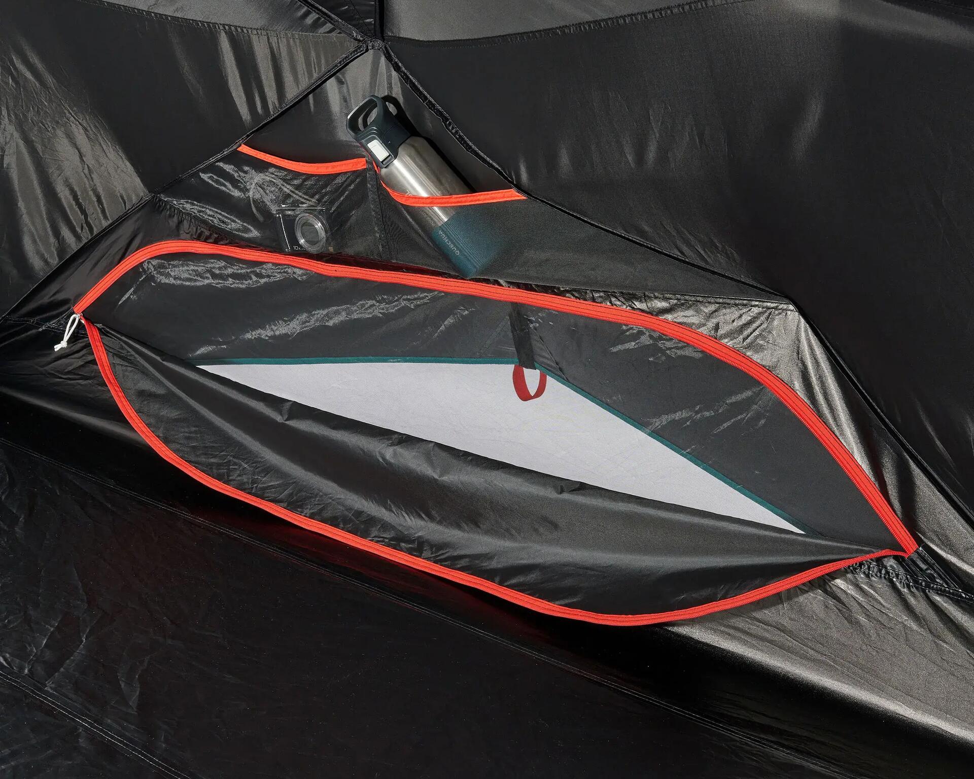 2 portas laterais e 2 ventilações mecânicas que proporcionam uma ventilação máxima quando estão abertas. Quarto interior em malha de rede respirável e ventilações mecânicas. Para permitir circular e renovar o ar entre o quarto e o teto duplo e limitar ao máximo o fenómeno natural da condensação, foi introduzido um espaço entre o teto duplo e o chão em toda a superfície da barraca