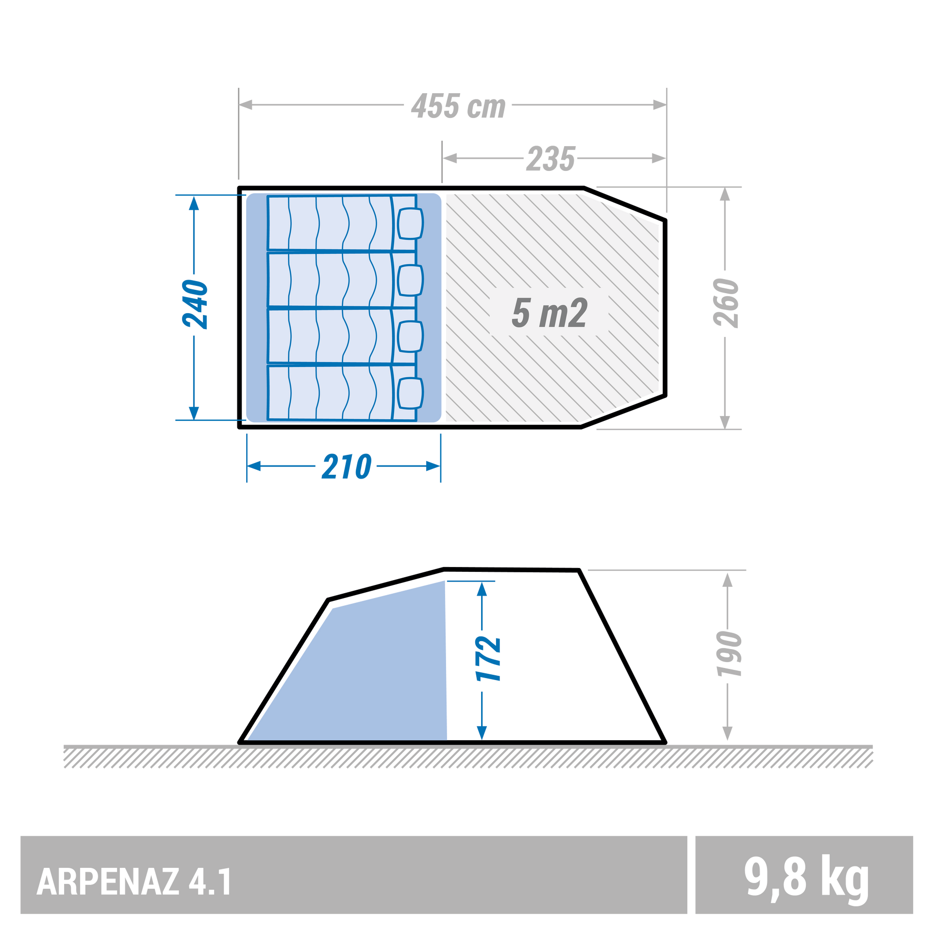 Sala com 5 m² e altura dentro da barraca de 1,90 m. Essa barraca possui um chão côncavo que se pode levantar na entrada em caso de chuva e uma janela transparente com persiana. O quarto desta tenda pode acolher no máximo 4 colchões de 60 cm de largura. Poderá também acolher um casal que procura um quarto muito grande.