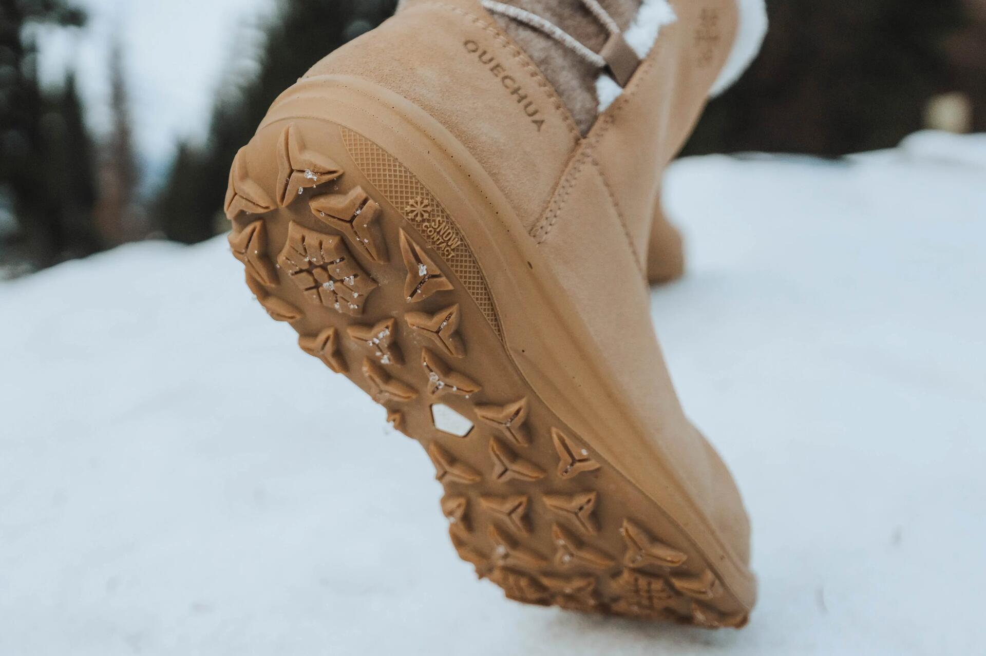 As solas SNOWCONTACT são feitas de um material específico e apresentam um design de cravos adaptado para garantir a melhor aderência e tração possível. Elas são mais eficazes do que solas tradicionais em superfícies nevadas. Em caso de uso em piso gelado, a adição de grips antiderrapantes pode proporcionar maior segurança.