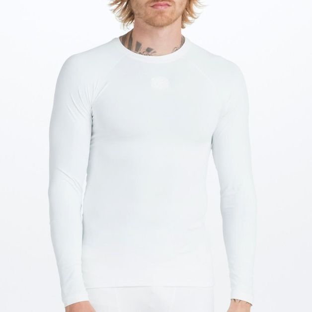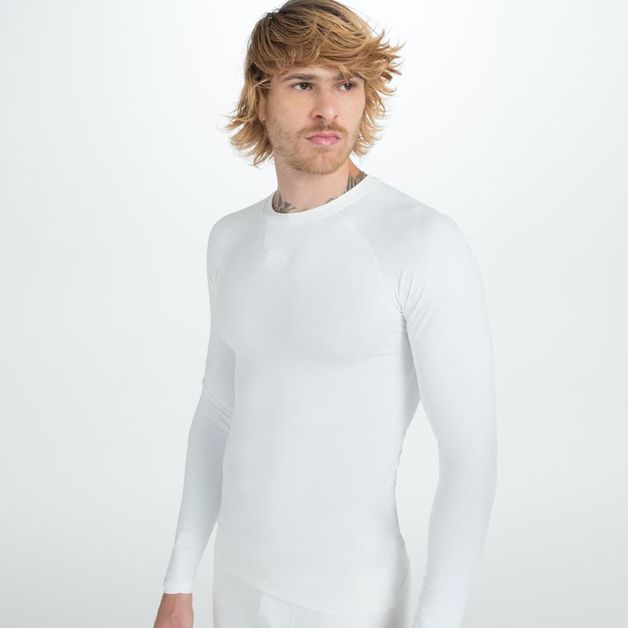 Camisa térmica masculina confeccionada em malha leve de poliamida e elastano, com fio tecnológico que contém proteção solar FPS 50+ dos raios UVA e UVB. Modelagem slim fit, bem ajustada ao corpo, com manga longa raglan e gola careca. Possui costuras flat sem atrito com o corpo e logo Umbro Pro Training em termo centralizado na parte frontal superior.