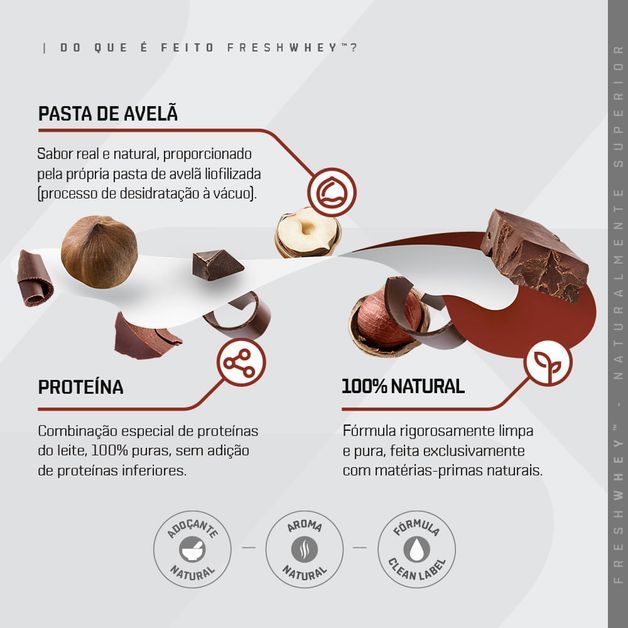 QuTabela Nutricional - Imagemhttps://duxnutrition.vtexassets.com/assets/vtex.file-manager-graphql/images/e3b94617-2f95-4318-9d34-d6ec5a04912d___0dc10f087ac9271bfcd0901263e0a911.jpg Tabela Nutricional Novo{ "name": "Fresh Whey", "items": [ { "name": "Chocolate e Avelã", "description": "Pote 900g", "portionTitle": "Porções por embalagem: Cerca de 29", "portionText": "Porção: 31 g (1 dosador)", "table": { "dailyV Tamanhos900g Texto Longo{"texto-longo":{"title":"Sugestões de Uso","text":"FreshWhey pode ser consumido a qualquer hora do dia, como um lanche saudável e saboroso, podendo ser misturado em preparações doces ou salgadas, quentes ou frias.","id":1}} TipoProteínas Concentradas e Blends Tipo Descrição VisívelDescrição Destaque Titulo ComercialProteína 100% pura e limpa Com ingredientes naturais a base de frutas e nuts de verdade.BenefíciosSem Soja, Sem Glúten, Sem Ingredientes Artificiais Benefícios VitrineGanho de massa CaracterísticasAminograma Completo, 20g Proteína, Frutas e Nuts de Verdade, Ingredientes Liofilizados, Adoçantes e Aromas Naturais Descrição 1O que é FreshWhey™?Apesar das variadas opções de suplementos de proteínas no mercado, encontrar qualidade e sabor, unidos em uma fórmula limpa e pura, é um desafio. FreshWhey™ é uma nova categoria de prot Descrição 2ProteínasFórmula especial com 3 tipos de proteínas do soro do leite: concentrada, isolada e hidrolisada. Essa combinação traz o melhor de cada uma delas: sabor, pureza e qualidade. São 20g de proteína por dose, com a Descrição 3Frutas e NutsPara nós, o melhor sabor vem da natureza. Feito com alimentos naturais, nosso objetivo foi trazer o frescor das frutas e o gosto de verdade do chocolate e das pastas de amendoim e avelã. Isso só é possív Descrição 4100% NaturalFórmula rigorosamente limpa e pura, feita exclusivamente com matérias-primas naturais, sem ingredientes inferiores ou artificiais. Seguimos um padrão de excelência na escolha de cada proteína, cada fruta, Descrição 5Por trás do rótulo™: ProteínaAs proteínas são os suplementos mais famosos e mais populares. É fácil entender por quê. A proteína é o alicerce nutricional do corpo, sendo encontrada nos músculos, ossos, pele, cabelos, Descrição Background/arquivos/Pagina-de-produtos_FreshWhey_Geral_03.jpg Descrição Inicial{"descricao-inicial":{"title":"Proteína Clean Label","description":"Com ingredientes naturais e à base de frutas e nuts de verdade.","color":"#fff","id":1}} Destaque Banner Tecnologia{"destaque-banner-tecnologia":{"bannerMobile":"https://duxnutrition.vtexassets.com/assets/product-layout/imgs/66a3543a-5649-4ec8-9aab-8049e6c4403e___0707b533ff757822bfc115781e2f8088.jpeg","banner":"https://duxnutrition.vtexassets.com/assets/product-layout Destaque Banner Texto{"destaque-banner-texto":{"title":"## Ideal para","text":"• Quem busca uma proteína clean label, com ingredientes naturais, muito sabor e qualidade superior\r\n• Quem deseja aumentar a ingestão diária de proteínas de forma saborosa e nutritiva\r\n• Pratic Destaque Banner Fórmula{"destaque-banner-formula":{"title":"Cada porção oferece 20 g de proteína de alto valor biológico, com perfil completo de aminoácidos, garantindo absorção eficiente e suporte nutricional de alto nível para a construção e manutenção da massa muscular.\n\nC Destaque Banner Inovação{} Destaque Combinação{"destaque-combinacao":{"text":"Para quem busca sabor autêntico e nutrição de qualidade, as frutas e nuts do nosso FRESHWHEY passam por um processo de liofilização, tecnologia que remove a água sem expor os ingredientes ao calor, preservando sabor, aroma Destaque FAQ{"destaque-faq":{"title":"Perguntas Frequentes","items":[{"itemTitle":"Este produto é concentrado, isolado ou hidrolisado?","itemText":"FreshWhey é uma combinação especial dos três tipos de proteínas do soro do leite: concentrada, isolada e hidrolisada.", Destaque Informações Nutricionais{"destaque-informacoes-nutricionais":{"title":"## Informações Nutricionais","items":[{"flavorReplaced":"chocolate e amendoim","flavor":"Chocolate e Amendoim","id":1,"text":"Porções por embalagem: Cerca de 29\nPorção: 31 g (1 dosador)","description":"**Ing Destaque Ingredientes{"destaque-ingredientes":{"title":"## Ingredientes","items":[{"itemTitle":"Whey Protein","itemText":"O whey é uma proteína de alto valor biológico derivada do soro do leite e rica em aminoácidos essenciais, especialmente os de cadeia ramificada (BCAAs), c Destaque Slider Textos{"destaque-slider-textos":{"title":"","image":"https://duxnutrition.vtexassets.com/assets/vtex.file-manager-graphql/images/eef19a92-24a0-4e64-91cf-915db2171c88___c189869b4c616de906fa5b8545386928.jpg","imageMobile":"https://duxnutrition.vtexassets.com/asse Destaque Texto Inicial{"destaque-texto-inicial":{"title":"## FRESHWHEY","text":"Nosso FRESHWHEY é uma linha exclusiva de proteínas desenvolvida com ingredientes naturais, incluindo frutas e nuts de verdade, que proporcionam sabores autênticos e surpreendentes.\r\nSua fórmula é EmbalagemPote (em pó) FinalidadeEsporte e Fitness, Saúde e Bem Estar GêneroUnissex GlútenContém Horário de ConsumoDepois do treino, Ao acordar Ícones{"icones":[{"title":"20g Proteína","image":"https://duxnutrition.vtexassets.com/assets/vtex.file-manager-graphql/images/7878f76d-d583-417a-82d5-74b0f11d30fb___3e228787e51a411976e204dbdef1e384.png","id":1},{"title":"Frutas e Nuts de Verdade","image":"https Ícones Claims{ "items": [ { "text": "20g Proteína", "image": "https://duxnutrition.vtexassets.com/assets/vtex.file-manager-graphql/images/7878f76d-d583-417a-82d5-74b0f11d30fb___3e228787e51a411976e204dbdef1e384.png" }, { "text": "Frutas Indicado paraAuxilia Ganho de Massa Muscular Inf Ingredientes{"ingredientes":[{"flavor":"Chocolate e Avelã","text":"Proteína de soro do leite concentrada, proteína de soro do leite isolada, pasta de avelã liofilizada, cacau solúvel, prote