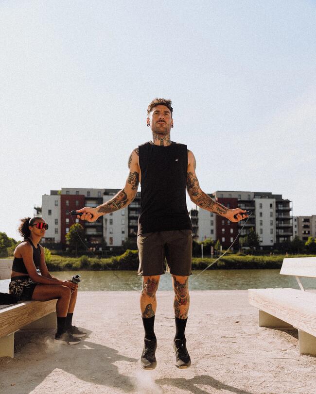 A tua caixa contém todo o essencial para sessões completas: - 1 corda de saltar 500 azul-marinho (8828273) de 3 m, leve e manejável (215 g), perfeita para cardio - 1 roda de abdominais 100 (8933020) compacta (diâmetro 19 cm, pegas 12 cm cada, largura roda 4 cm) para modelar abdominais - 1 elástico de musculação 15 kg (8484819) (comprimento: 1,04m e largura: 13mm) para reforço e mobilidade - 1 elástico de musculação 25 kg (8484820) (comprimento: 1,04m e largura 24mm) para mais resistência