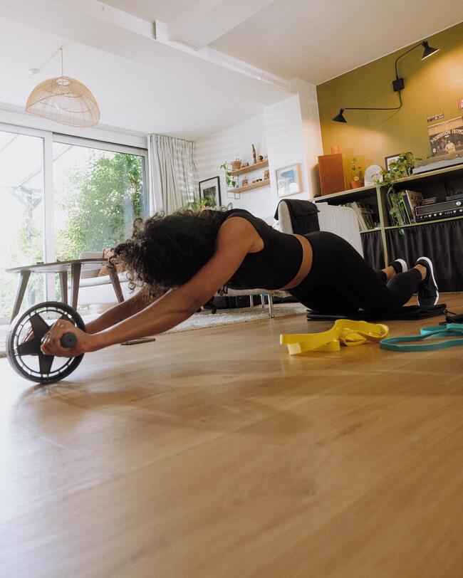 Trabalhe seus abdominais com a Ab Wheel. Fácil de desmontar, você pode guardar ou levar onde quiser.