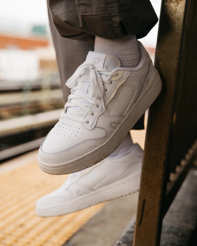 O branco neutro e as linhas limpas tornam o tênis um item atemporal essencial para qualquer visual.