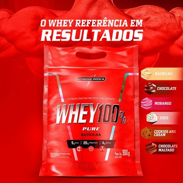 O Whey 100% Pure Pouch é o suplemento ideal e essencial para quem busca ganho de massa magra e recuperação muscular. Composto pela proteína concentrada do soro de leite, são 21 g de proteína por dose, 9,7 g de aminoácidos essenciais e 4,6 g de BCAA. Uma ótima opção para o pós treino, o Whey 100% Pure Pouch auxilia na manutenção da massa magra, possui baixo teor de carboidrato, gordura e sódio. Zero Glúten. Alta qualidade para a sua suplementação, o Whey 100% Pure Integralmédica contém matéria-prima importada, e ótima absorção pelo organismo, evitando a sensação de inchaço após o consumo. A proteína do soro é a fonte mais nobre de proteína do leite com alto valor biológico, isso devido a sua alta concentração de aminoácidos essenciais e aminoácidos de cadeia ramificada (BCAA), esses aminoácidos têm papel fundamental na síntese de proteínas e construção muscular. Whey 100% Pure Integralmédica está disponível em 6 sabores, versões pote de 900g, pote de 450g, Pouch de 900g e Pouch de 1,8kg.